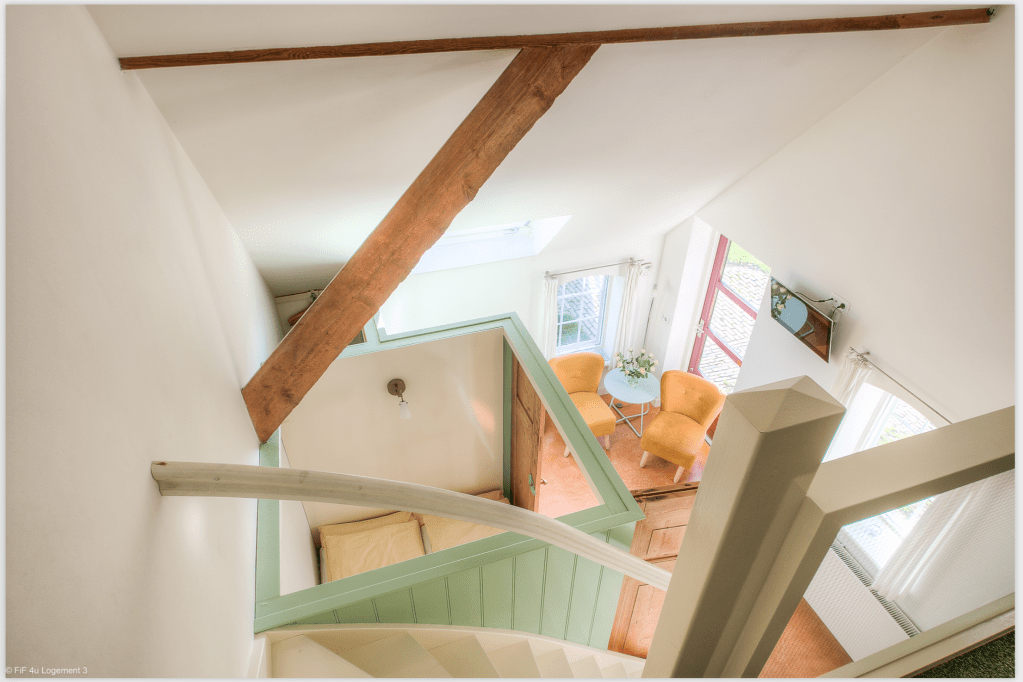 These apartments share a bathroom with a bath and shower. This bathroom is located upon entering the hall. Here you can go through the door on the left to room 1 or right up the stairs to room 2. Both rooms have 2 separate beds. Also suitable as a single room with a shared bathroom.