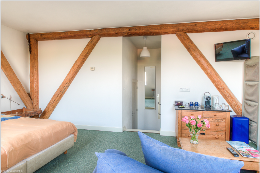 Prachtige zolderkamer op 1e verdieping voor 2 personen met 2 aparte bedden en eigen badkamer met bad en douche. Eventueel ook een slaapbank aanwezig met lattenbodem en matras voor 3e persoon.