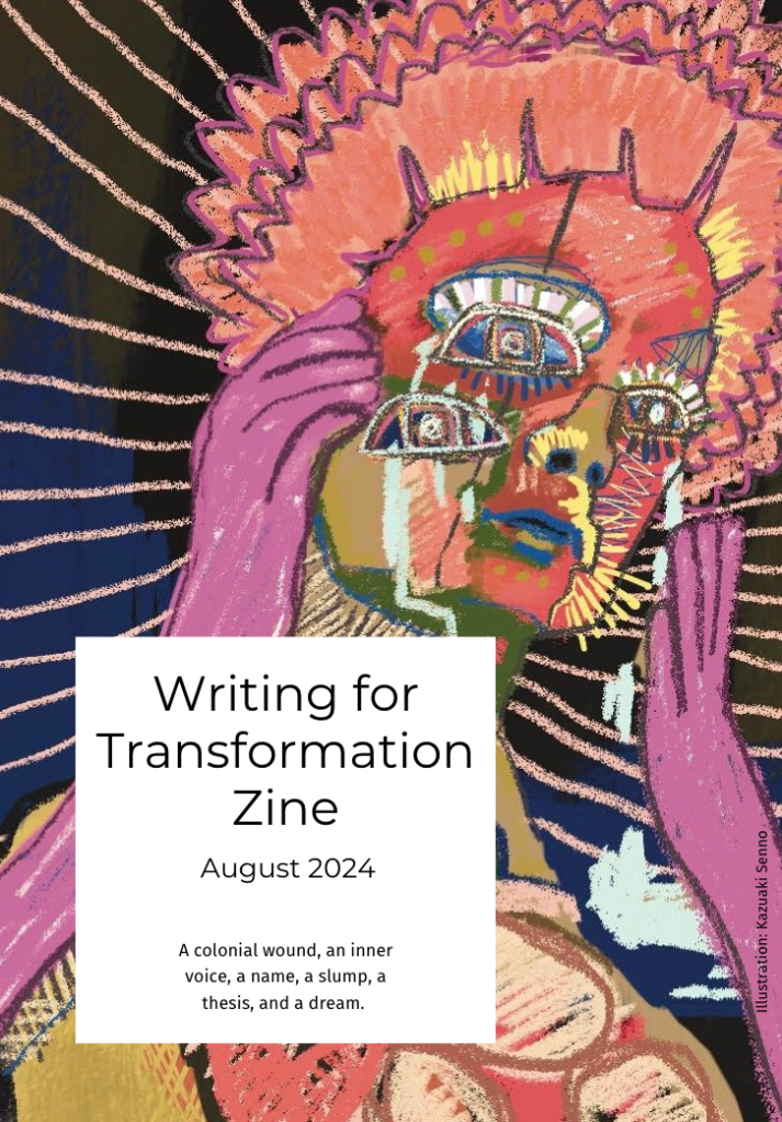 Read the Writing for Transformation Zine #1 with contributions by Samantha Bellenbaum, Martine Beernink, Ron Ma, Manuela Callari, , Grace Tan-Johannes, Ana Maria Ciobanu, and Akhlis Purnomo.